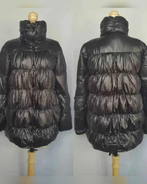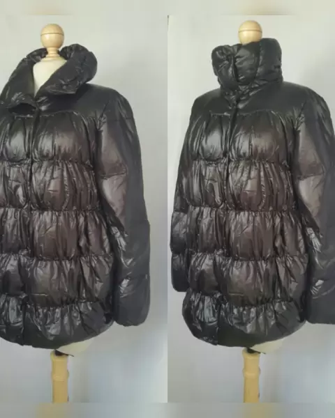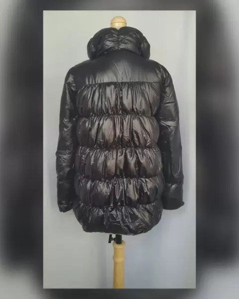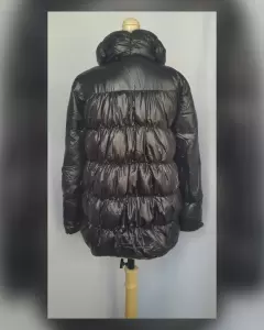 Cazadora acolchada efecto brillo tono NEGRO ÉBANO, corte evasé, cuello clásico c/solapas convertible a cuello alzado, cierre p/snaps, 2 bolsillos vivo laterales, manga larga terminada en puño cardigan interior p/mejor ajuste y relleno interior plumón y pluma. Talla L. Dimens cms: 43 hombro, 53 axila, 66 zona baja, 75 largo, 67 largo manga. 56% nylon, 44% poliéster, 90% plumón pato gris, 10% pluma.