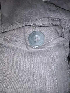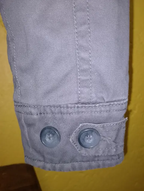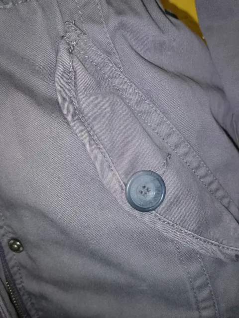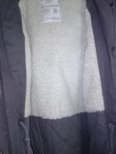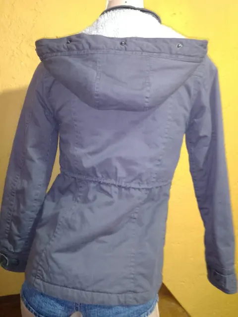 Cazadora Aéropostale T-XS en perfectas condiciones, el color es entre verde y gris (tono caqui). La capucha no es desmontable y le hace falta su peluche a la misma, trae dos bolsas laterales y dos frontales pequeñas todas cierran con botón que trae el nombre de la marca. Trae un cordón interno a la altura de la cintura para ajustar, la tela es como tipo gabardina y trae forro aborregado