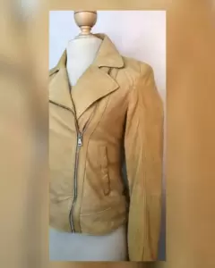 Cazadora color mostaza estilo biker en napa, corte slim, cuello con tira, cierre mediante cremallera frontal, dos bolsillos frontales, manga larga terminada en puño con cremallera, charreteras dobles con snaps en cintura parte posterior, herrajes tono plata brillante, forro interior. 100% piel ovina, forro: 67% algodón, 33% poliéster. Para limpieza con especialista. Talla M. Dimensiones cms: 39 hombro, 47.5 axila, 42.5 cintura, 46 zona baja, 57 largo, 56 largo manga.***LA PIEL DE ESTA PRENDA ES EXTRA SUAVE***ESTE PRODUCTO SE HA PRODUCIDO EN TENERIAS CERTIFICADAS COMO "LEATHER WORKING GROUP ORO", UTILIZANDO ENERGIAS RENOVABLES Y TECNOLOGÍAS QUE REDUCEN EL CONSUMO DE AGUA***