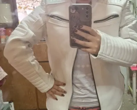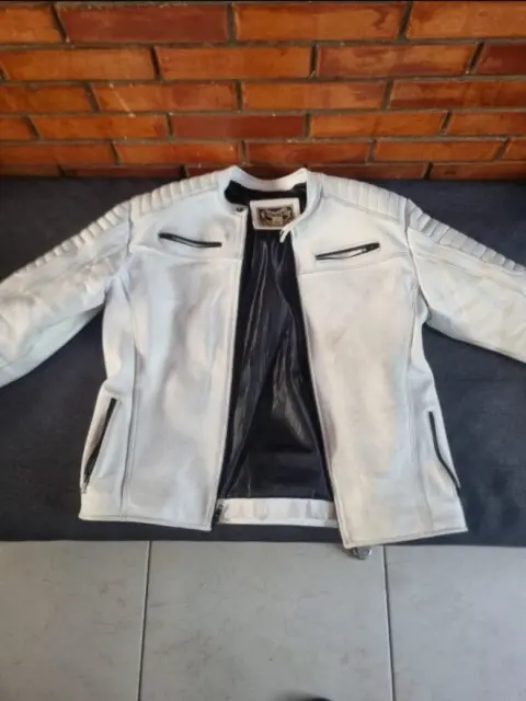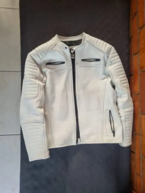 Cazadora blanca de piel de borrego, cuenta con varios cierres, todos funcionan correctamente, y fresca.