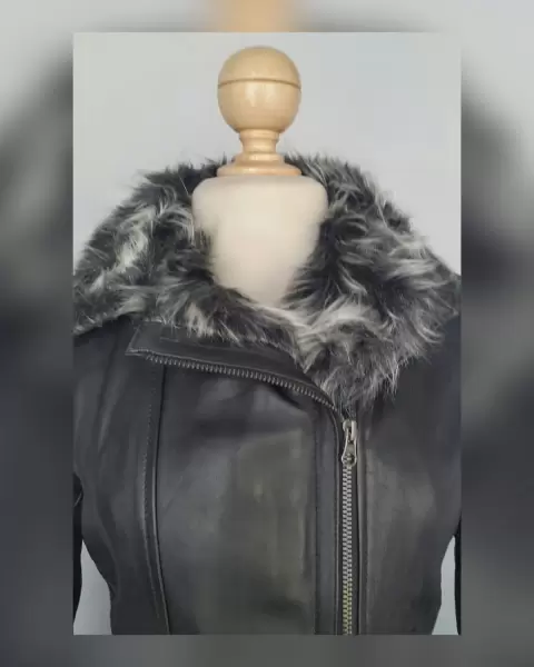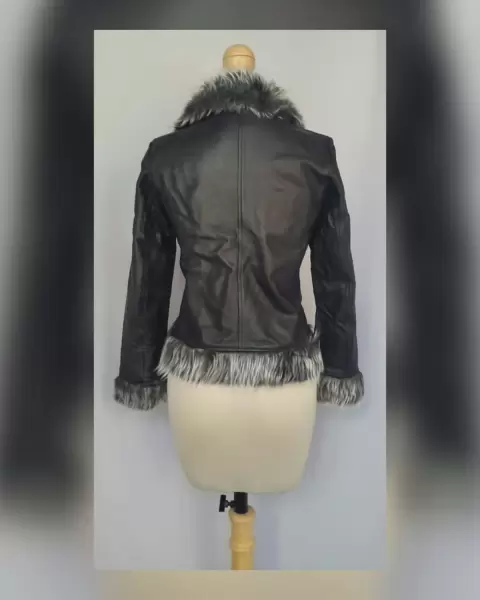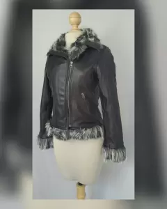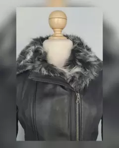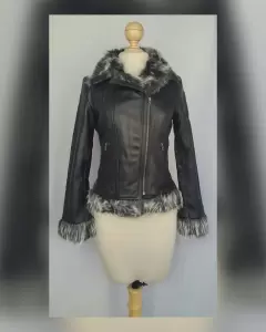 Cazadora en Piel c/Aplique Faux Fur. Cazadora en piel color NEGRO ÉBANO estilo biker, c/aplique faux fur zona cuello, mangas, baja y frontal interior NO DESMONTABLE, cuello redondo c/solapas, cierre p/cremallera, 2 bolsos vivo frontales c/cremallera, manga larga terminada en faux fur y forro interior. Talla L (REDUCIDA, da mejor a M). Dimens cms: 40 hombro, 49.5 axila, 44 cintura, 45 zona baja, 55.5 largo, 60 largo manga.100% piel bovina. Para limpieza con especialista.***SE ENTREGA CON SU BOLSA CUBREPOLVOS***LA PIEL DE ESTA CHAMARRA ES MUY SUAVE***