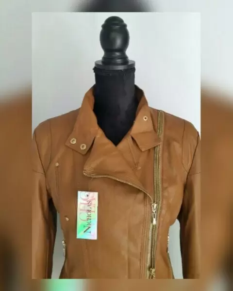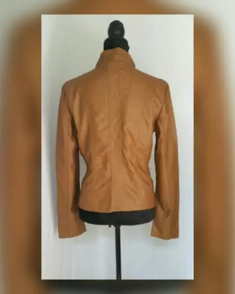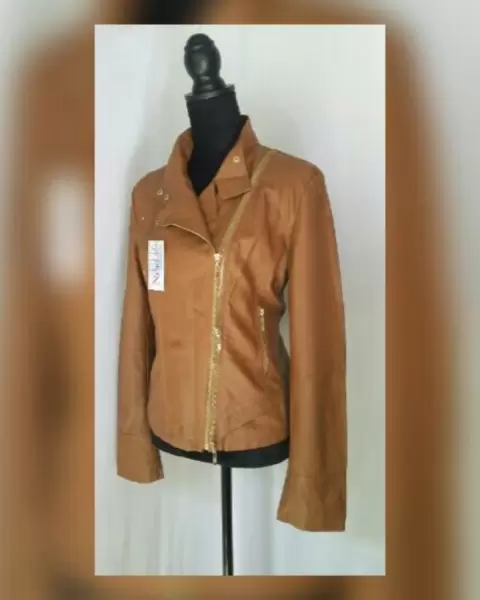 Cazadora en fake fur estilo biker color ANTE, cuello Perkins, cierre p/triple cremallera diagonal tono dorado, 2 bolsillos vivo c/cremallera, manga larga y forro interior animal print. Talla M. Dimensiones cms: 42 hombro, 51 axila, 44.5 cintura, 52 zona baja, 60.5 largo, 64 largo manga. 100% poliuretano. P/lavado en seco.