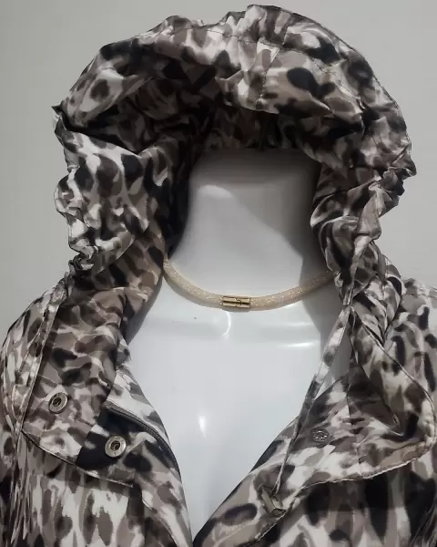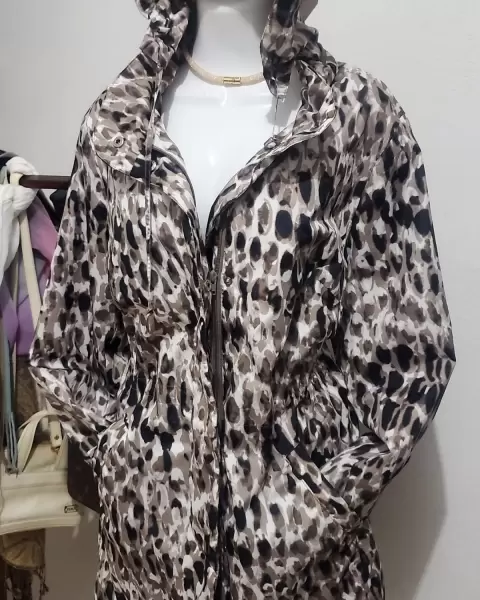 Manga larga, estampada, cierre al frente , con cordones en la cintura que se ajustan a tu silueta. Con capucha ,bolsillos a los lados