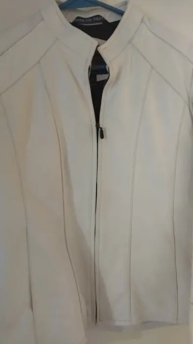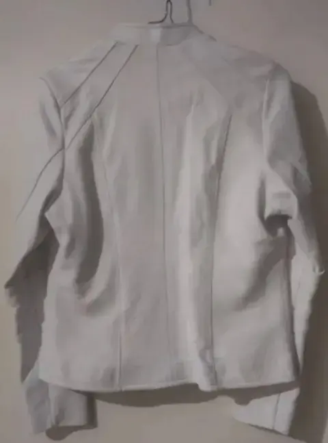 Chamarra blanca pielDa talla S (aunque dice L)Muy buen estadoPiel 100%borregoSuave, no está dura 40cm de axila a axila 60cm alto