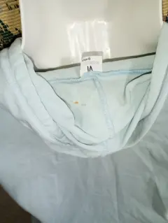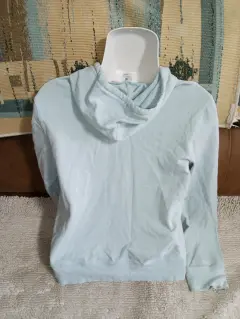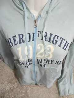 Bonita chamarra color azul cielo, con bolsas a los lados, y detalles estampados, y gorra, tela delgada pero que estira bastante, tiene pequeñas manchas en el gorro por dentro, no interfiere su uso