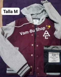 Chamarra beisbolera de mujer. Chamarra beisboleraCapucha y bolsas al frenteVino/Gris ClaroForro grueso capitonado al interiorBotón de presiónTalla MSeminueva