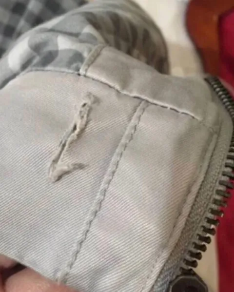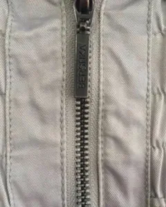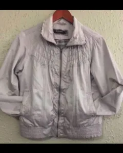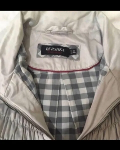 Chamarra bershka. Talla L(30). No viene tan amplia, yo manejo por lo general tallas S y M y me queda perfecta. El único detalle se muestra al final de la foto, lo tiene por dentro así que no afecta en nada su uso. La tela es suavecita