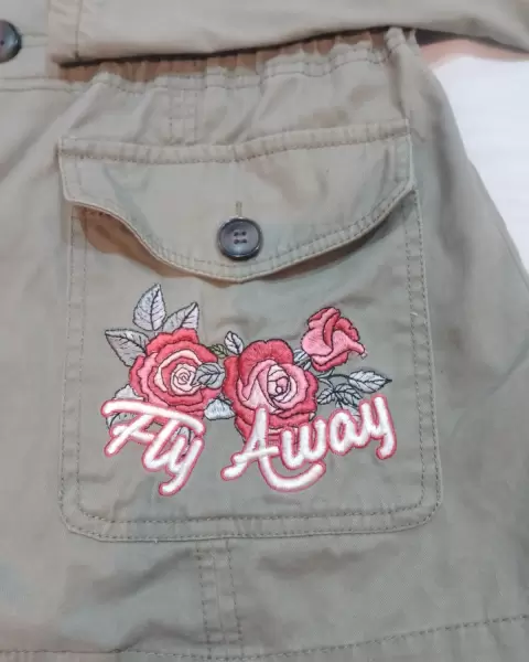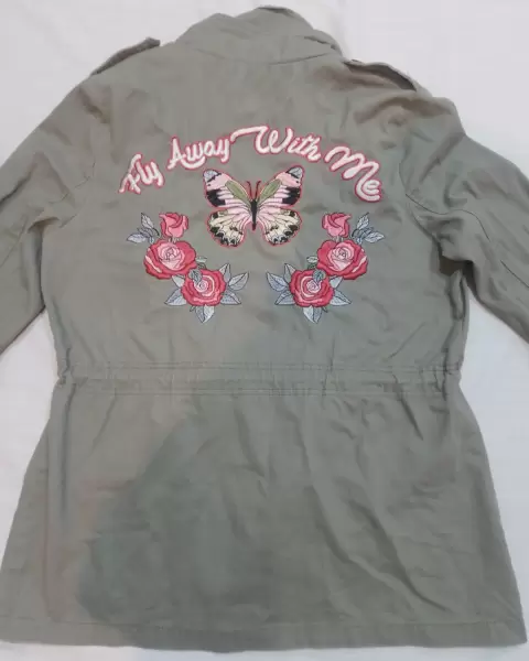 Chaqueta en color verde militar con hermoso bordado en la espalda, la tela es ligera y cómoda, ajustable en la cintura.Medidas:Hombros: 40cmEspalda: 49 cmAncho de brazo: 17.5cmLargo de brazo: 63cmLargo de la chamarra: 65 cm