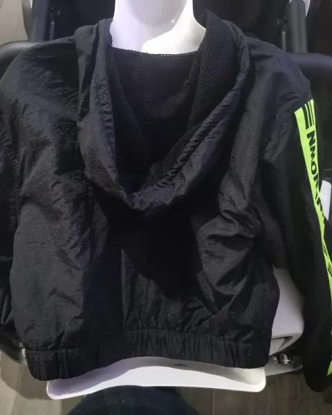 Bonita chamarra Bomber rompevientos, con detalles en las mangas en color neón y en color negro muy bonito, trae gorro y no tiene detalles, el forro por dentro es de red.