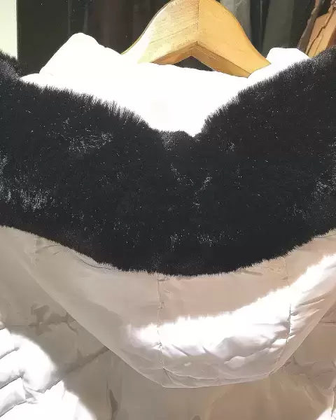 Cazadora calientita blanca (nueva) trae:Cinturón removibleCapucha removibleborde de pelos imitación animal negro removible borde de pelos imitación animal café removible Cierre o cremallera grandeBrochesBroches extraBolsillosBolsillos invisiblesBorde de mangas elasticas invisibleLlavero de almohadita transparente de aireTalla extra grande EG.Marca Melya Melody Paris