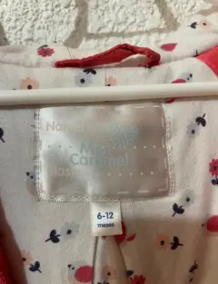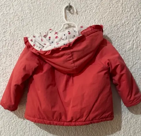 Chamarra en color coral, tiene dos bolsitas en la parte de enfrente, tiene gorro, un forro muy lindo de flores y es muy calienta.En perfecto estado!