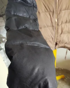 Chamarra con mangas de vinil. Chamarra impermeable con mangas de vinil color negro, con doble cierre, terminación de curva. Diseño único y original
