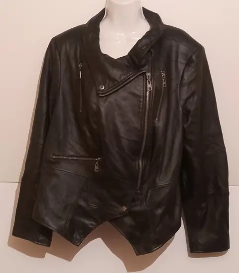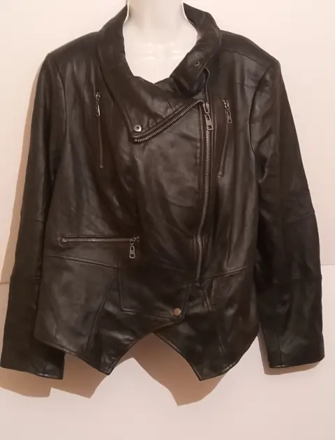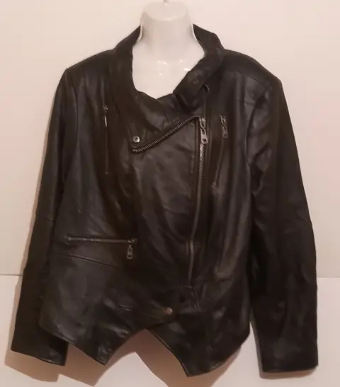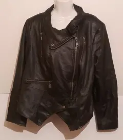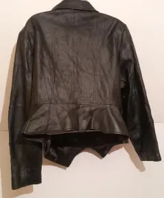 Bonita chamarra de piel, marca G.I.L.I. get It love It, talla 24 W, mide en hombros 45 cm, en pecho55 cm , en cintura 53 CM y de largo tiene 63 cm( checar medidas). Bonito diseño, en muy buen estado. De la parte de atrás presenta algunas marcas por haber estado doblada ( como se observa en las fotos)