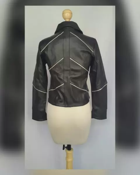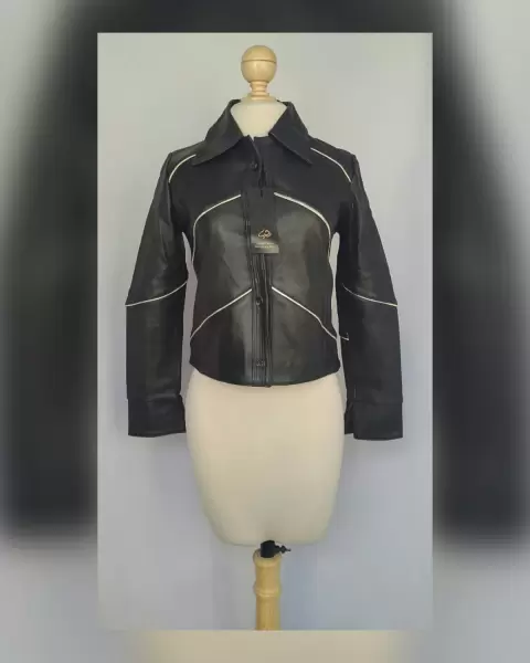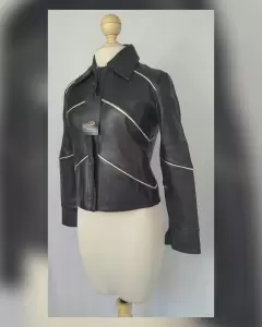Chamarra Cropped Piel c/Bien Craquelado. Chamarra cropped en piel color negro c/bies bitono plata/beige craquelado, corte evasé, cuello clásico c/solapas, cierre p/botonadura, bolsillo interior c/cremallera, manga larga terminada en abertura y forro interior. Talla M (da a S/M). Dimensiones cms: 39 hombro, 46 axila, 48 cintura, 47 zona baja, 52.5 largo, 59 largo manga. 100% piel bovina. P/limpieza con especialista.***LA PIEL DE ESTA CHAMARRA ES EXTRA SUAVE***EL BIES TIENE UN EFECTO CRAQUELADO MUY BELLO***
