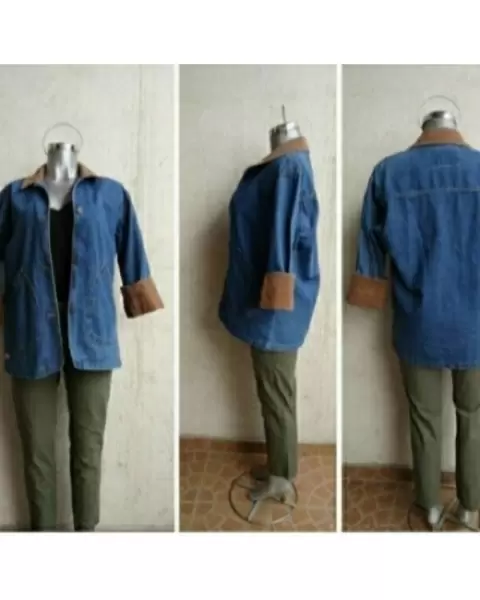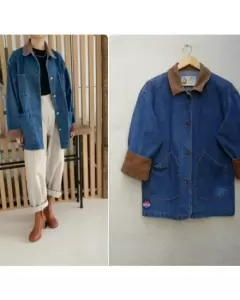 Chamarra de mezclilla overzize en talla M con mezclilla de color cafe en cuello y puños al doblar las mangas para que se vea la parte cafe la manga queda 3/4 como detalle tiene una decoloracion en bolso del lado izquierdo se ve en fotos MEDIDAS ziza a ziza 59cm largo 73cm hombros 51cm queda parecida a foto de referencia