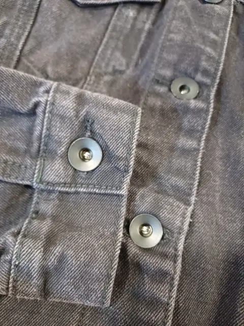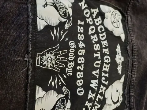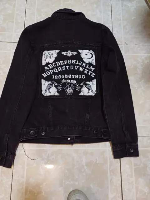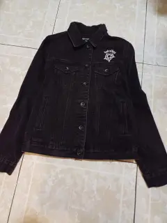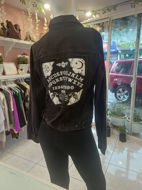 Hermosa chamarra negra de mezclilla con estampados y símbolos.Las medidas son hombros 38 CM, ax a ax 47 CM, largo 57 CM.