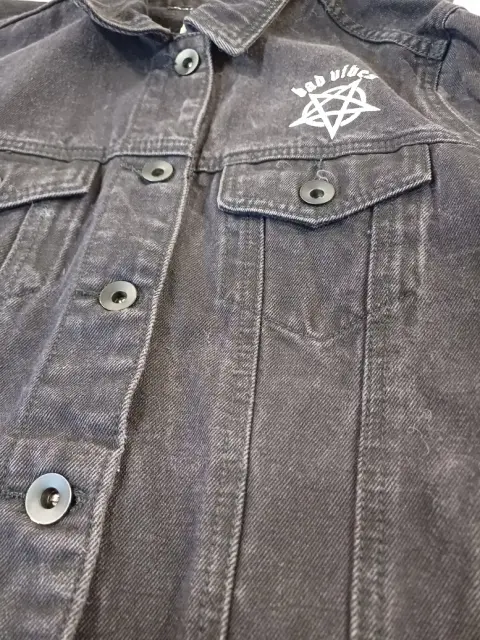 Chamarra de mezclilla. Hermosa chamarra negra de mezclilla con estampados y símbolos.Las medidas son hombros 38 CM, ax a ax 47 CM, largo 57 CM.