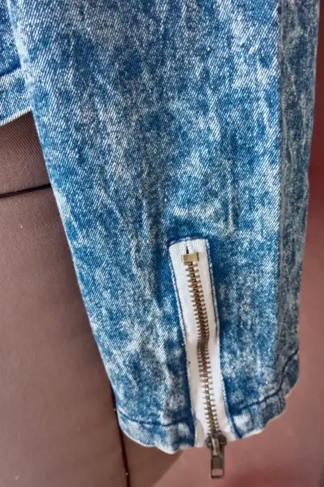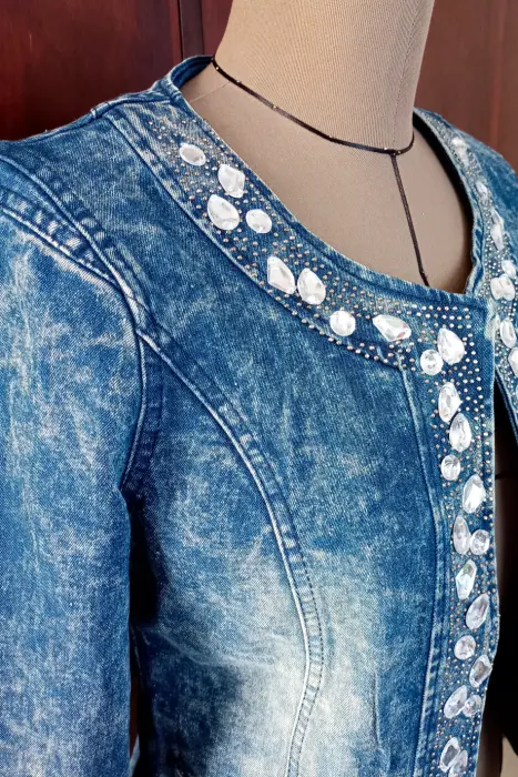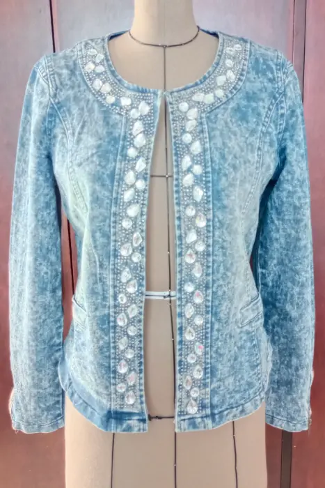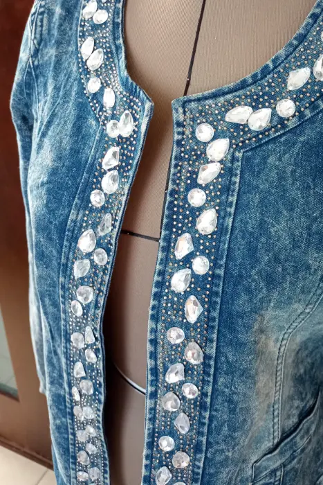Linda chamarra de mezclilla con pedreria la frente , lo que le da un toque muy femenino, en los puños de las mangas tiene detalles de cierre, para darla mas comodidad y hogura. Nueva, excelentes condiciones, pero no cuenta con su etiqueda.