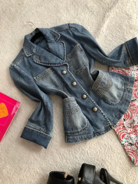 Hermosaa chaqueta de mezclilla estilo vintage, manga 3/4, con bolsas al frente, botones de metal, Medidas: busto 47 cm. Hombros 38 cm. Largo 58 cm. Súper bonita!