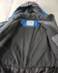 Chamarra calientita para niño talla 12, color gris con azul, con gorro,tela polar por dentro, en muy buenas condiciones.