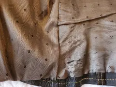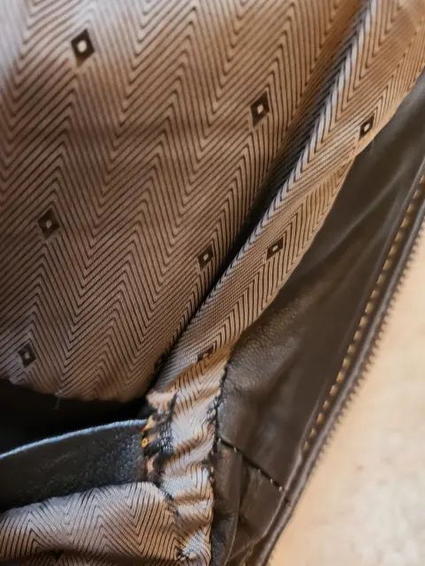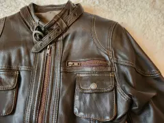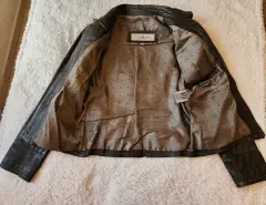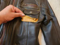 Chamarra de piel genuina, de corazón chocolate, las costuras en contraste color miel, excelente calidad, es corta con detalle muy distintivos, hace muy bonita silueta, te marca la cintura ya sea que lanuses cerrada o abierta, es talla s, no estira mucho, si trae dos detalles en el forro pero de ahí en fuera esta en excelentes condiciones!