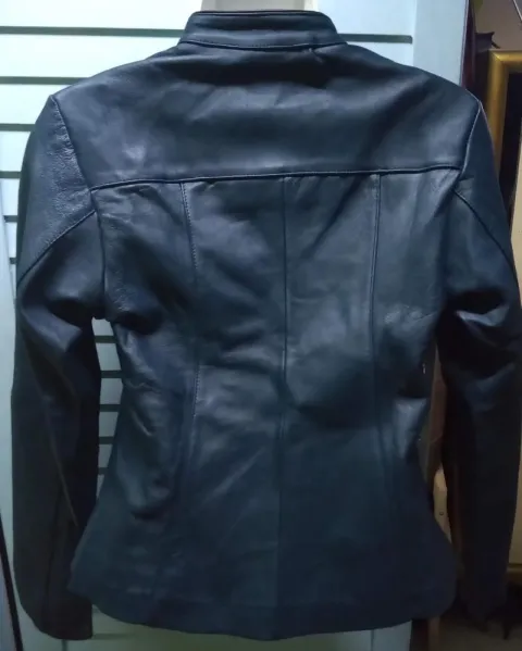 Chamarra de piel color azul, corte acinturado, talla chica, con cierres en las bolsas.