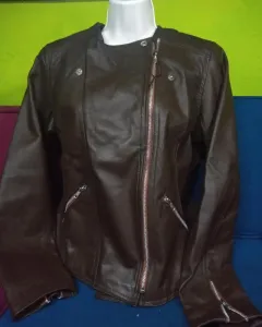Chamarra de piel café, talla grande, con cierres en bolsas y muñecas.