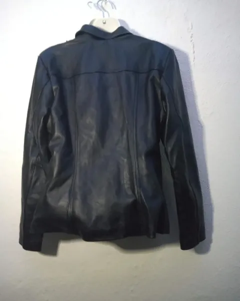 Chamarra de piel con cuello alado, color negro, talla grande.