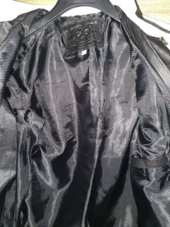 Chamarra de piel marca Cesar Ochoa, talla Ch, en buen estado, color negro y franjas blancas con cierre al frente y en mangas con cierres en el pecho izquierdo uno es bolsa y el otro solo simula, bolsillla dos a los costados y una interna con forro el único detalle se muestra en foto está el la parte trasera a la altura del hombro derecho no es visible a simple vista.