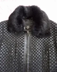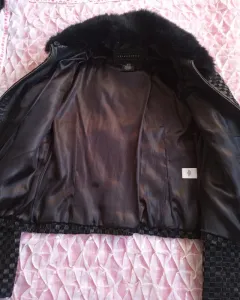 Chamarra de piel entretegida con cierre y cuello de pelo de conejo desmontable en color negro, forro de satín.