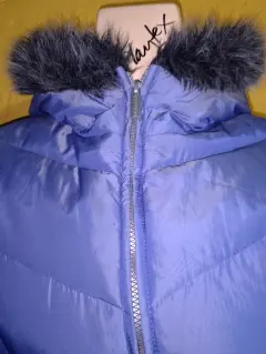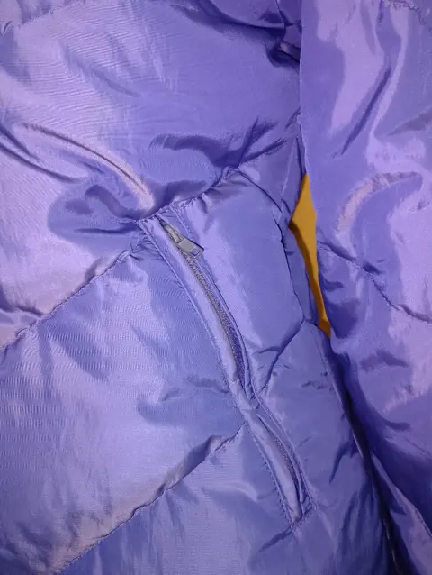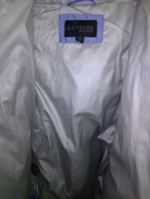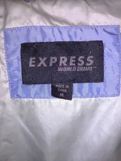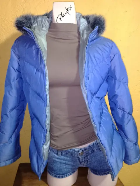 Chamarra Express de pluma, talla mediana, color azul metálico y el forro interno es gris metálico. Está en muy buen estado, las bolsas laterales tienen cierre ( el detalle es que el forro interno de las bolsas se deshilacho un poco) también tiene una manchita en el forro interno se ve en la última foto.