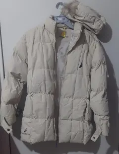 Chamarra de plumas de ganso Marca NAUTICA. Chamarra de mujer, marca NAUTICA, plumas de ganso, color, beige, talla 34, incluye gorro.