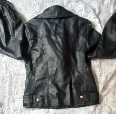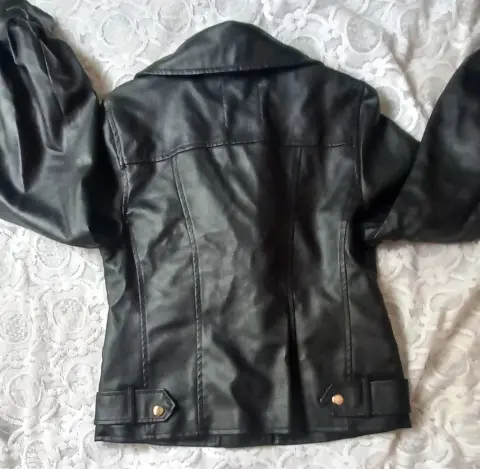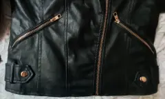 Chamarra de vinipiel, con cierres en bolsas y botonadura al frente y detrás, a la cintura