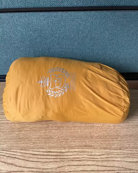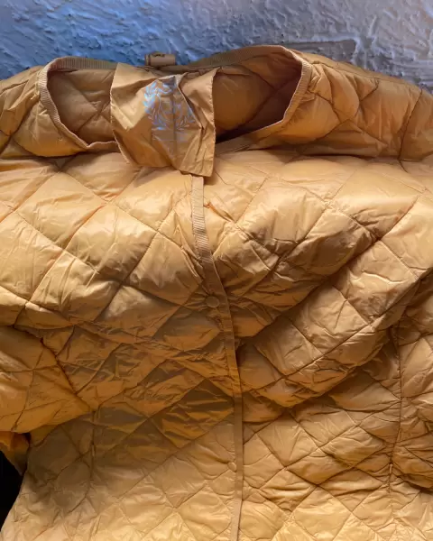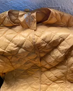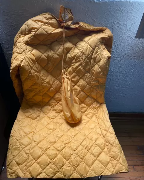 Chamarra mostaza con broches al frente y trae su bolsa pequeña para guardarse en sus muy cómoda y calientita