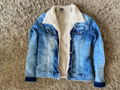 Chamarra denim borrega. Chamarra mezclilla con borrega, dice talla G pero queda Perfecto a xs- s sin cerrar , supongo era talla kids.Hermosa y calientita