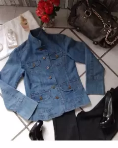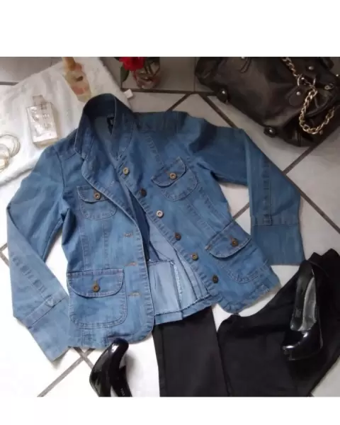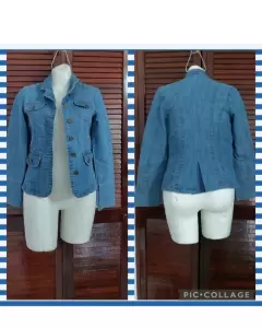 Chamarra Denim tipo blazer. Esta preciosísima, lo mejor que la puedes usar con pantalón de vestir, jeans o con lo que mas te agrade. 100% mezclilla. Talla XS y quizá queda a S pero revisa tus medidas.. Mide de axila a axila 43 cm, hombros: 36 cm, largo: 56 cm. Prácticamente NUEVA, SE USO 1 SOLA VEZ.