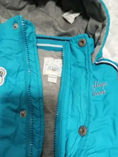 Chamarra para bebé tipo deportiva con un detalle se osito beisbolero por delante y detrás. La capucha es desmontable y cuenta con dos bolsillos, cierre frontal con zipper y botones. Aproximadamente solo 4 puestas