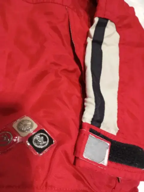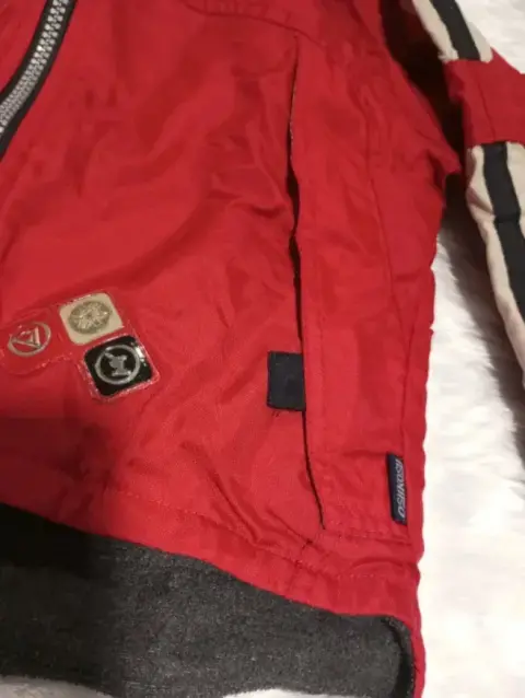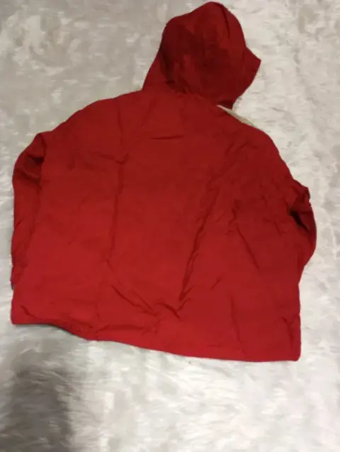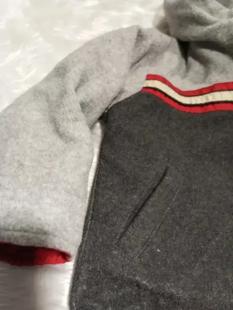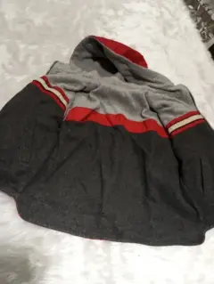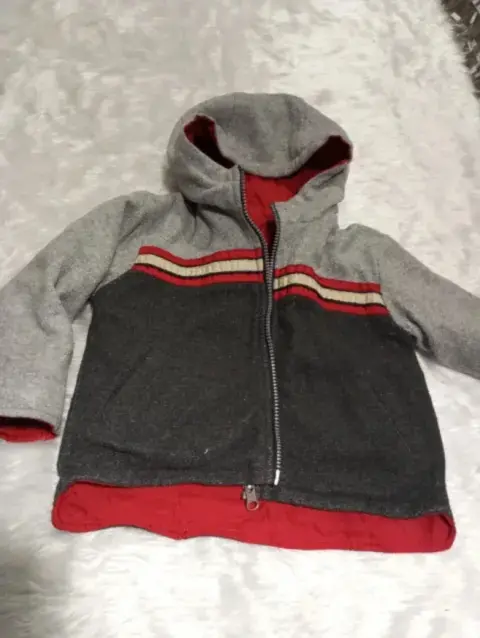Chamarra de doble vista, por un lado es roja y por otro es gris afelpado, tiene capucha y tres bolsillos, talla 24 meses.