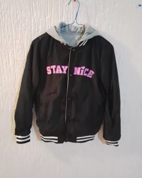 Es una chamarra tipo colegial , doble vista, por un lado es negra ,de poliéster, con franjas blancas en puños y cintura , por el otro lado es gris claro de algodón, su diseño está muy padre, te encantará.