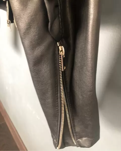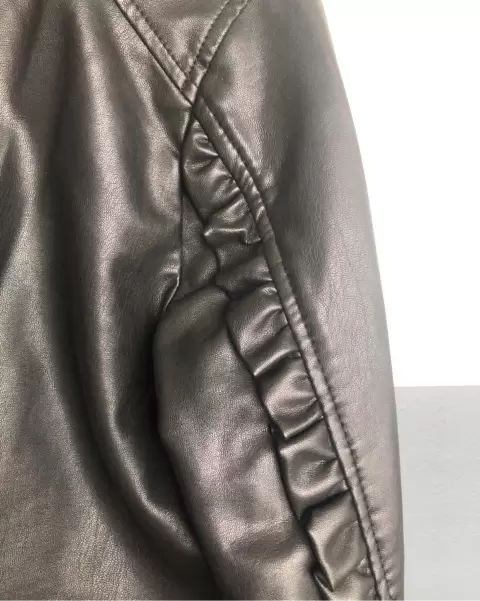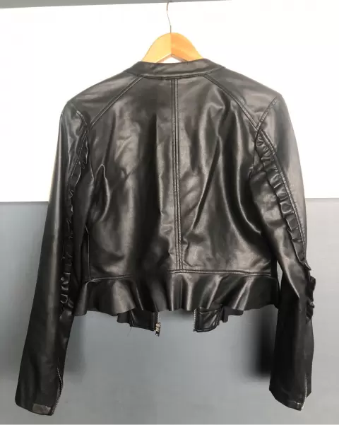 chamarra efecto piel. chamarra cuello redondo, corte peplum, con olán en las mangas!medidas axila a axila 44 cm, largo 54 cm , manga 65 cm
