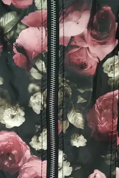 Chamarra negra floreado con tonos rosados y hojas verde olivo.