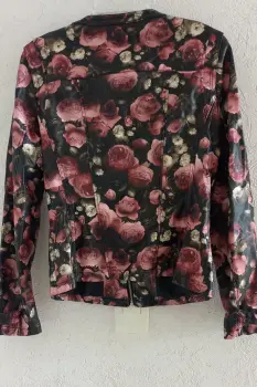 Chamarra floral. Chamarra negra floreado con tonos rosados y hojas verde olivo.
