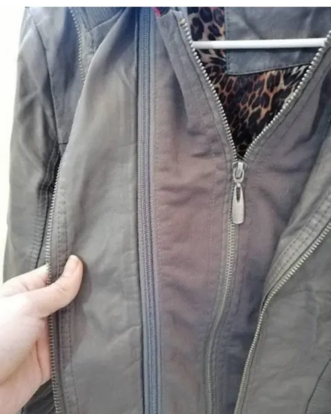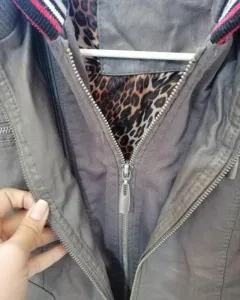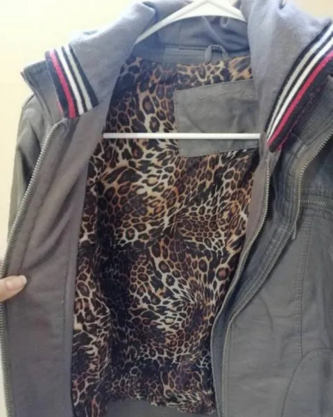 Chamarra de piel sintética en color gris, tiene gorro que se le puede quitar. Tiene pocos detalles de uso. Queda bien a talla M y S.