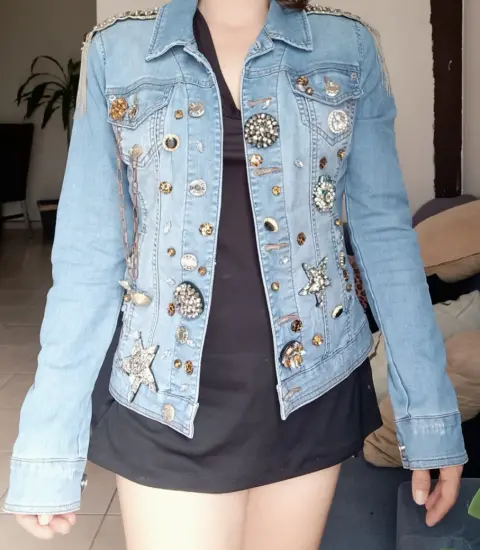 Hermosa chamarra de mezclilla con apliques de cristal, llega a la cadera fiel a su talla, dale un toque único y divertido a tu outfit