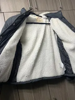 Chamarra HOLLISTER gris. Chamarra gris con borrega pachoncita súper calientita de cierre al frente y botones, trae gorro y bolsas al frente con cierre. Talla XL que puede quedar L
