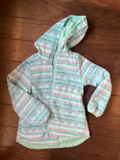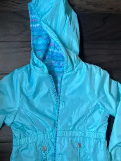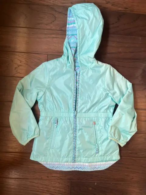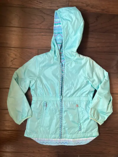 Linda chamarra impermeable con gorroReversible de fleece calientitaTiene bolsas de los 2 lados tanto impermeable como en el lado de fleeceColor azul AquaTalla 6/7Marca children’s place