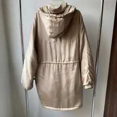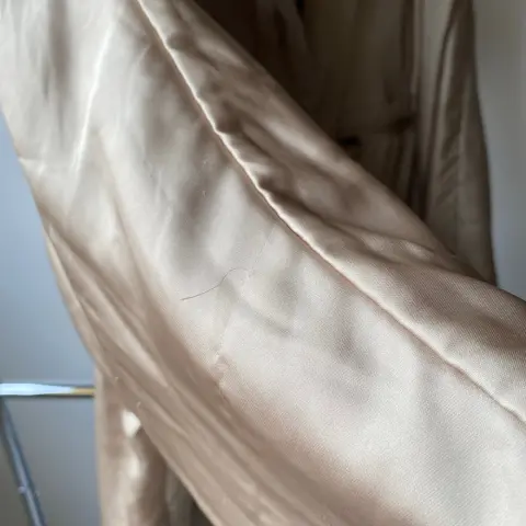 Chamarra larga dorada. Hermosa chamarra dorada tiene unos detalles en mangas un poco jalados unos hilitos, pero no se nota mucho, adjunto foto.