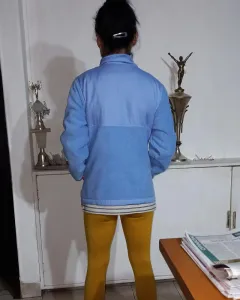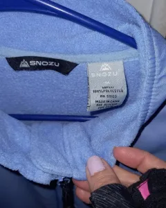 Chamarra Snozu, tela polar, excepto en área alrededor de hombros, que es tipo tela impermeable. Ligera, pero si calienta. Sin detalles, azul claro, talla mediana, bolsillos laterales, un bolsillo adelante. Snozu se dedica al diseño de chamarras y ropa de invierno, exclusivamente.