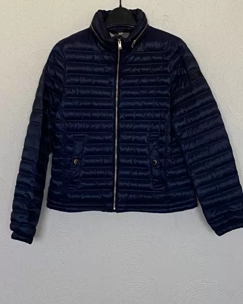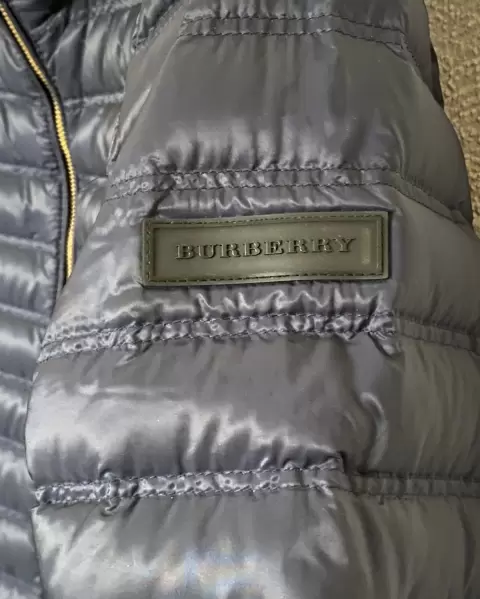 Chamarra light down Burberry. Chamarra súper ligera, se abrocha con cierre, tiene dos bolsas a los lados que se cierran com botón de presión, los botones y el cierre son dorados con la marca grabada, tiene un cierre en la parte de arriba donde viene un gorro que se saca y se vuelve a guardare ahí mismo.