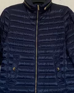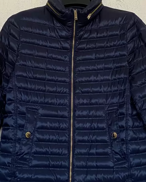 Chamarra súper ligera, se abrocha con cierre, tiene dos bolsas a los lados que se cierran com botón de presión, los botones y el cierre son dorados con la marca grabada, tiene un cierre en la parte de arriba donde viene un gorro que se saca y se vuelve a guardare ahí mismo.